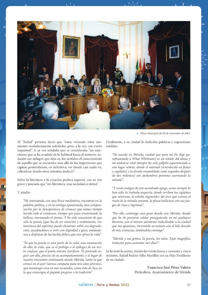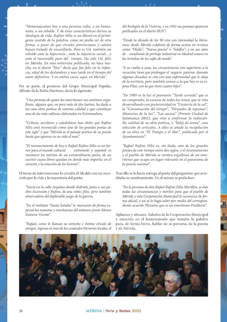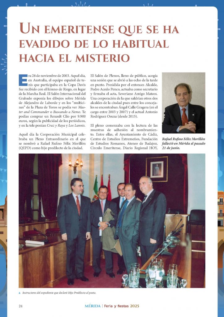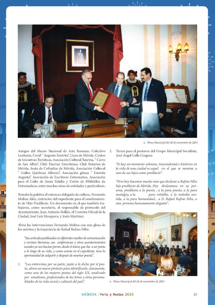 En una de mis etapas como concejal en el Ayuntamiento de Mérida tuve el honor y la responsabilidad de estar al frente del expediente para declarar al poeta Rafael Rufino Félix como Hijo Predilecto de la Ciudad.